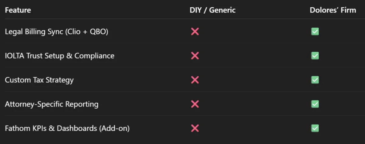 Dolores is a Clio Certified Consultant, and tax strategist with a laser focus on legal professionals. Her firm bridges the gap between law firm operations, bookkeeping, and tax optimization—so you can practice law, not accounting.